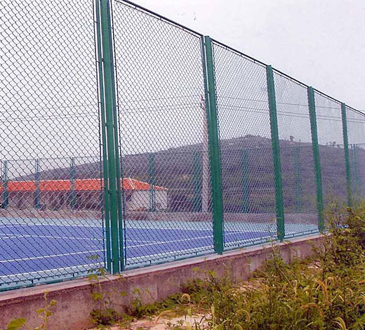 采用φ3.8镀锌线包塑网,网孔规格45MM×45MM,网高4 M,立柱用φ75钢管,横柱用φ60钢管刷二遍防锈专用底漆,二遍墨绿色面漆,包塑网用包塑扁铁压紧,用镀铬螺丝固定于网架上,做一扇1200×2000MM单门。在基础施工时,按照预埋件施工示意图所标明的尺寸,要先预埋好预埋件。挖500*500的地槽,灯柱预埋件的尺寸为300*300mm,围网预埋件的尺寸为 250*250mm。每个预埋件用4个12mm的钢筋焊接固定,钢筋的长度为400mm。钢筋在端部弯起。 围网由包塑网、立柱、横杆以及连接构件组成。网高4米,所以在围网中间设立一跟横杆,用φ75钢管,主要增强围网的受力。围网立杆的间距由球场四周范围的尺寸决定,一般间距不超过3.8米。也不能太小,否则增加成本。
